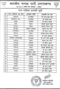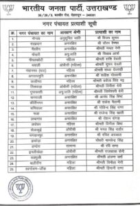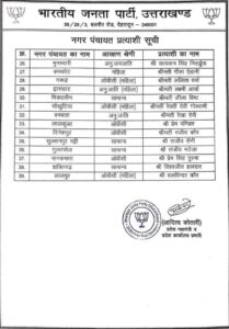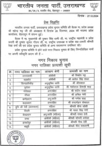Uncategorized December 27, 2024Anil Rawat भाजपा ने निकाय चुनाव के मेयर प्रत्याशियों की पहली सूची की जारी, देखें पूरी सूची। Spread the loveरुद्रपुर। बेबाक चर्चा नामांकन पत्रों की लेने के पहले दिन ही बीजेपी ने अपने मेयर प्रत्याशियों की सूची जारी कर दी है। देर रात जारी हुई सूची ने सियासी हलचलें तेज कर दी हैं।