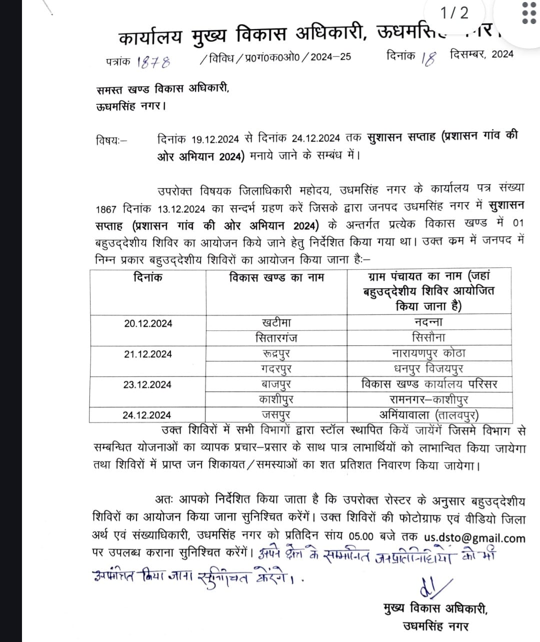 संबंधित खण्ड विकास अधिकारियों को निर्देश दिए गए हैं कि स्टॉल लगाकर सरकारी योजनाओं की जानकारी दी जाए। साथ ही ग्रामीणों की समस्याएं भी सुनी जाएंगी। जिसके तहत बहुदृदेशीय शिविर का अयोजन किया जाएगा।