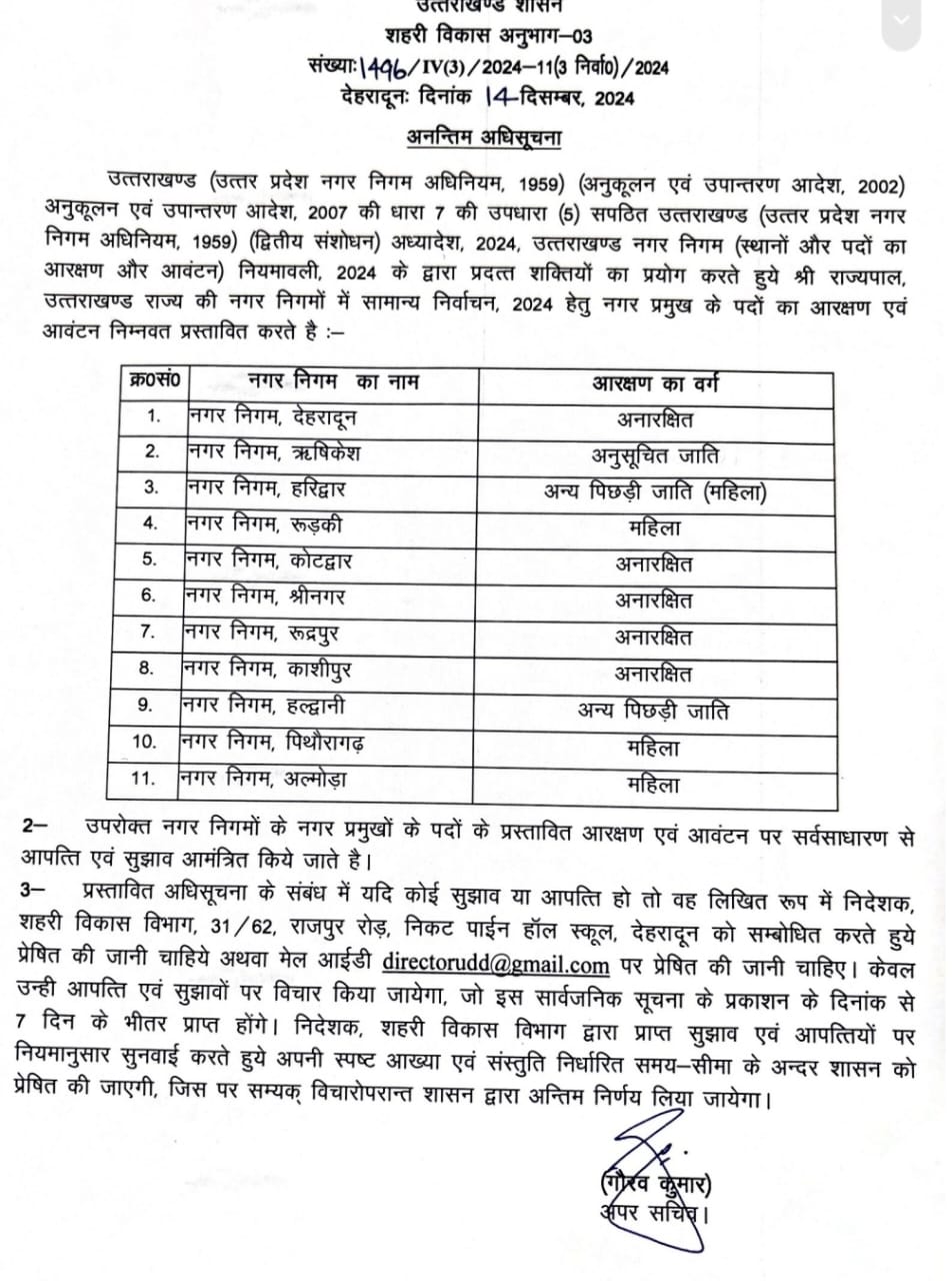 एलान किया गया है कि जिला उधम सिंह नगर से इस बार मेयर प्रत्याशी की सीट सामान्य होगी। सम्पूर्ण जिले की कोर सीट रुद्रपुर मानी नही जाती स्वघोषित है। जिस तरह शिशु को गर्भनाल से सारे पोषण तत्व मिलते हैं, वैसे ही जिले की राजनिति को पोषण देने वाली सीट रुद्रपुर है। यहां की मेयर सीट से दावेदारी पाकर जीतने वाला उम्मीदवार देहरादून और दिल्ली से हर तरह का पोषण पा सकता है। सीट के वर्ग पर हारने वाला कोई भी शहरवासी निराश ना हो अभी चाय के कई चक्कर उम्मीदवारी पर लग सकते हैं। अभी बौर फूंटे है। अब यह देखना होगा की कौन सी पार्टी किस उम्मीदवार पर अपना दांव खेलती है। इस बार के नगर निगम के चुनाव के नतीजों से ही 2027 के विधानसभा चुनावों के परिणामों की आधारशिला भी रखी जाएगी।